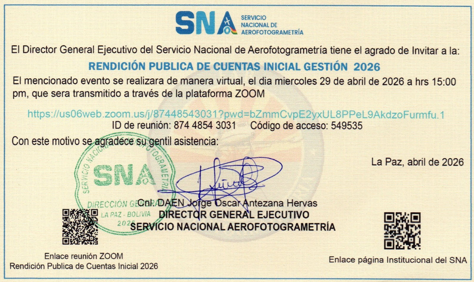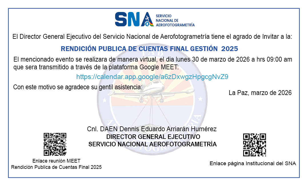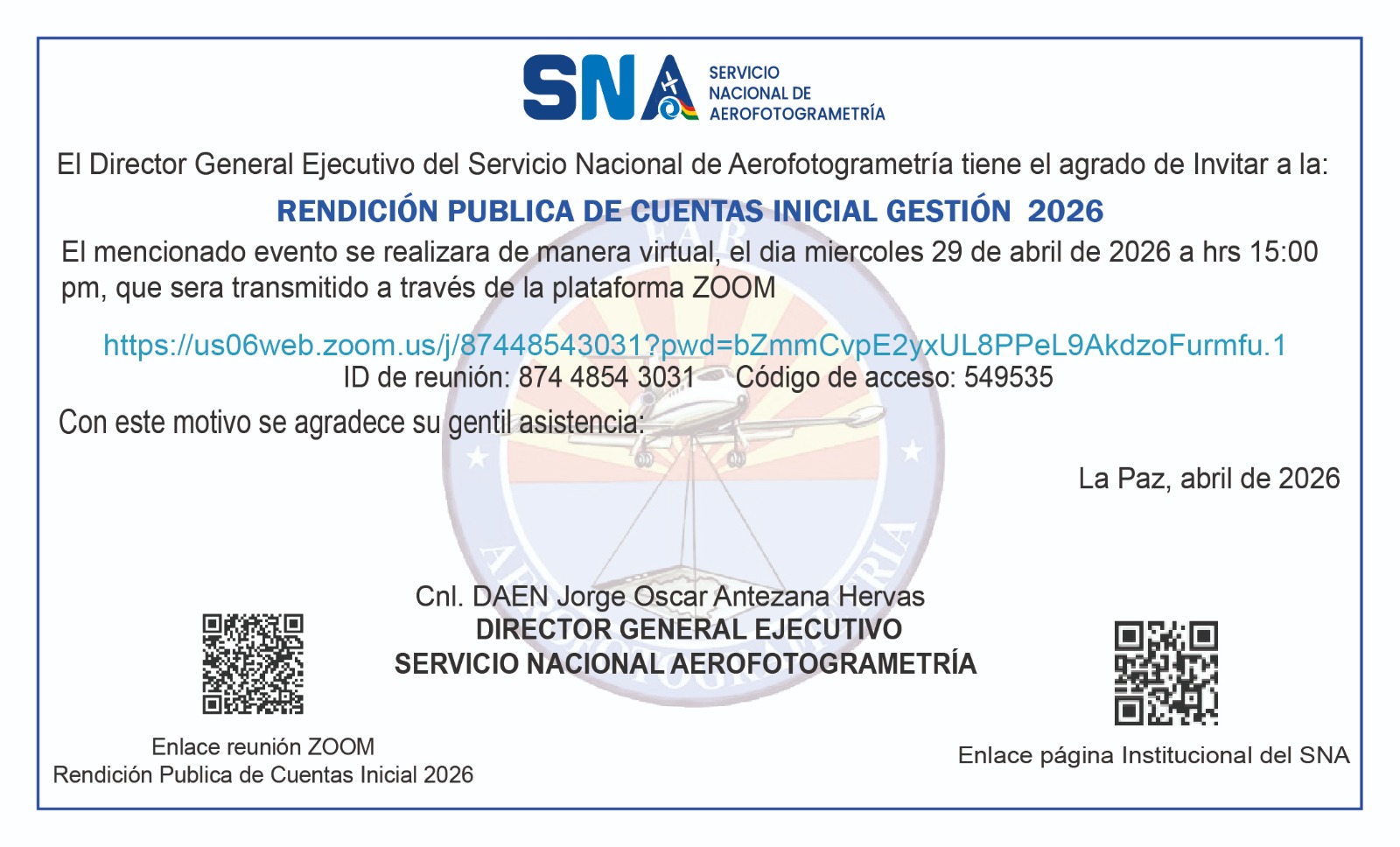 El Servicio Nacional de Aerofotogrametría (SNA) nació con una misión clara: apoyar el desarrollo del país y fortalecer la defensa nacional a través de información geoespacial confiable, precisa y estratégica. Con más de 48 años de experiencia, somos la entidad reguladora del sensoramiento remoto aéreo aerotransportado tripulado y no tripulado en Bolivia y nos hemos consolidado como un aliado clave para la planificación territorial, la seguridad y el crecimiento sostenible de la nación.
